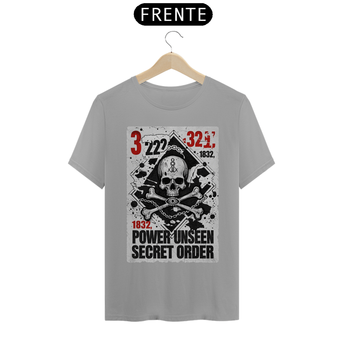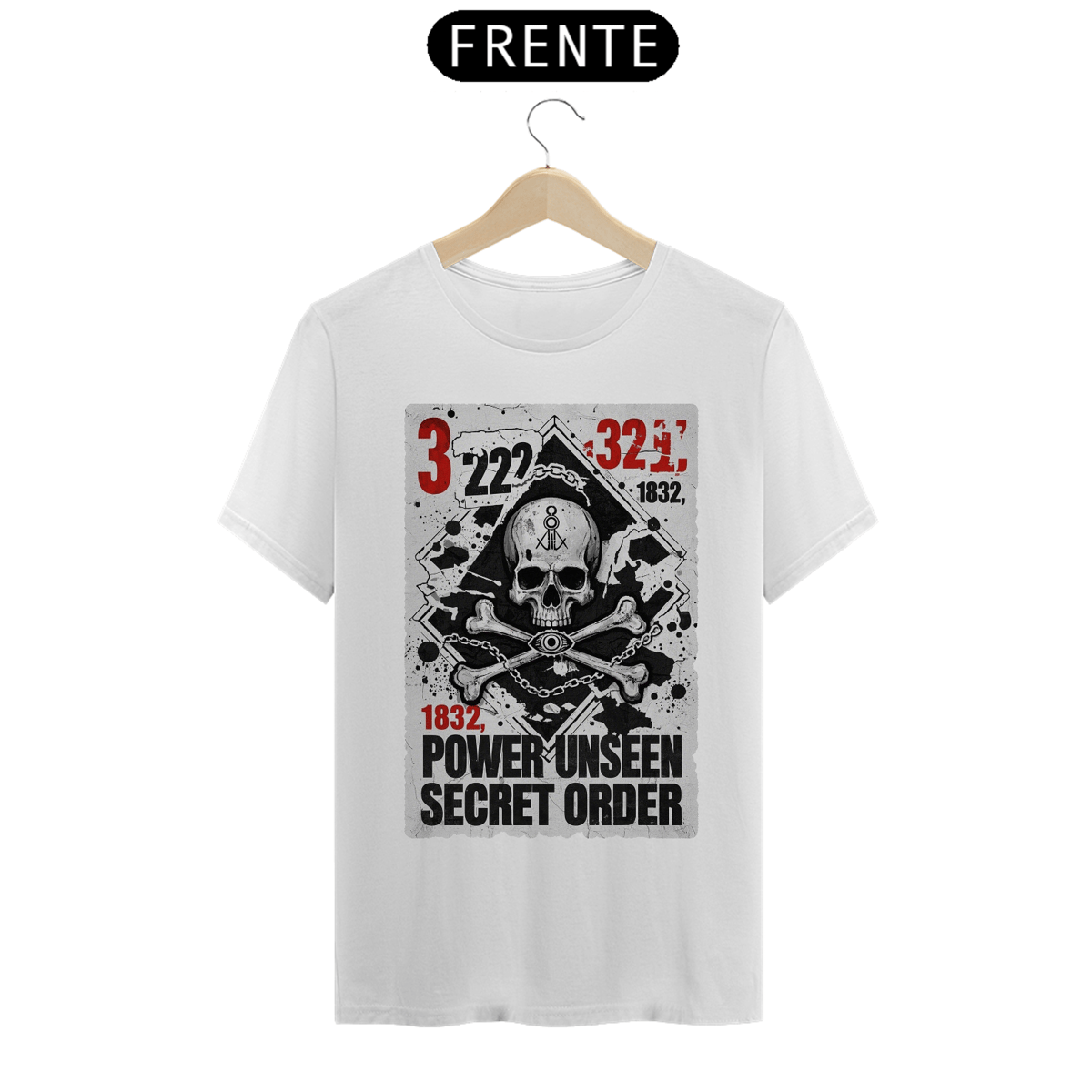 Nossa camiseta "Skull and Bones" vai além do óbvio. Cada detalhe da estampa foi cuidadosamente projetado para transmitir mensagens ocultas e códigos criptografados, inspirados nas tradições secretas da sociedade. Aqui estão alguns elementos que você encontrará: